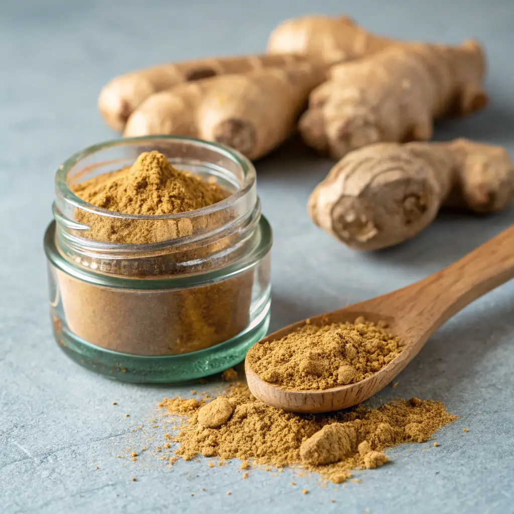 Finely ground dried ginger with a warm, spicy flavor, commonly used in cooking and traditional remedies.